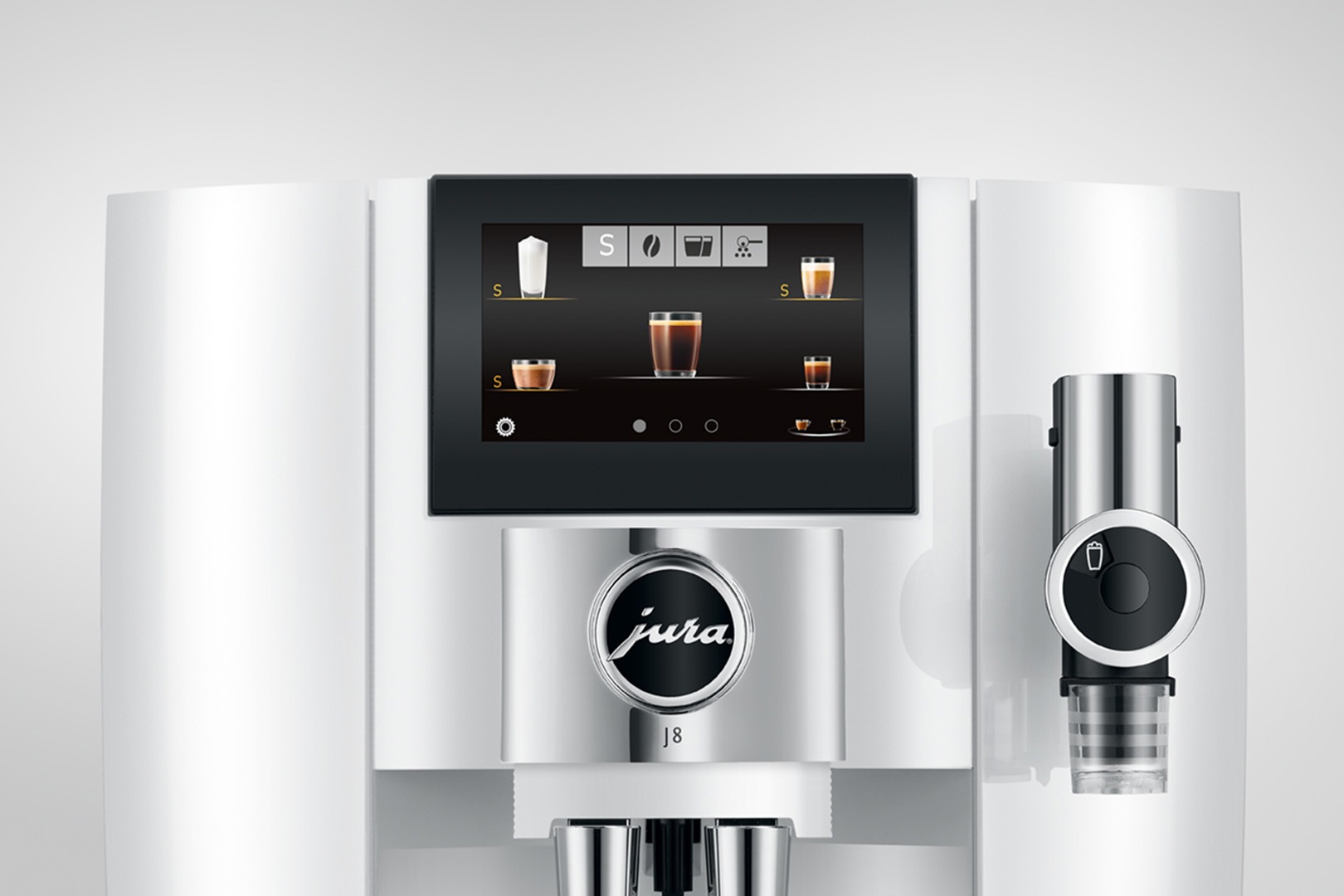 Jura J8 vyniká také funkcí Coffee Eye, která umožňuje jednoduché sledování umístění šálku při přípravě kávy nebo kávových specialit. Díky tomuto inteligentnímu senzoru se výběr speciality na displeji automaticky přizpůsobí umístění šálku pod hlavní výpustí nebo pod tryskou pro kávo-mléčné nápoje. Toto vylepšení přináší ještě snadnější a intuitivnější ovládání kávovaru Jura J8.