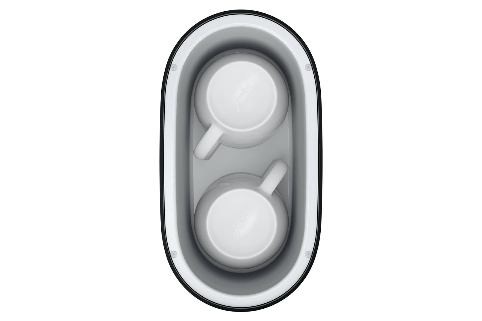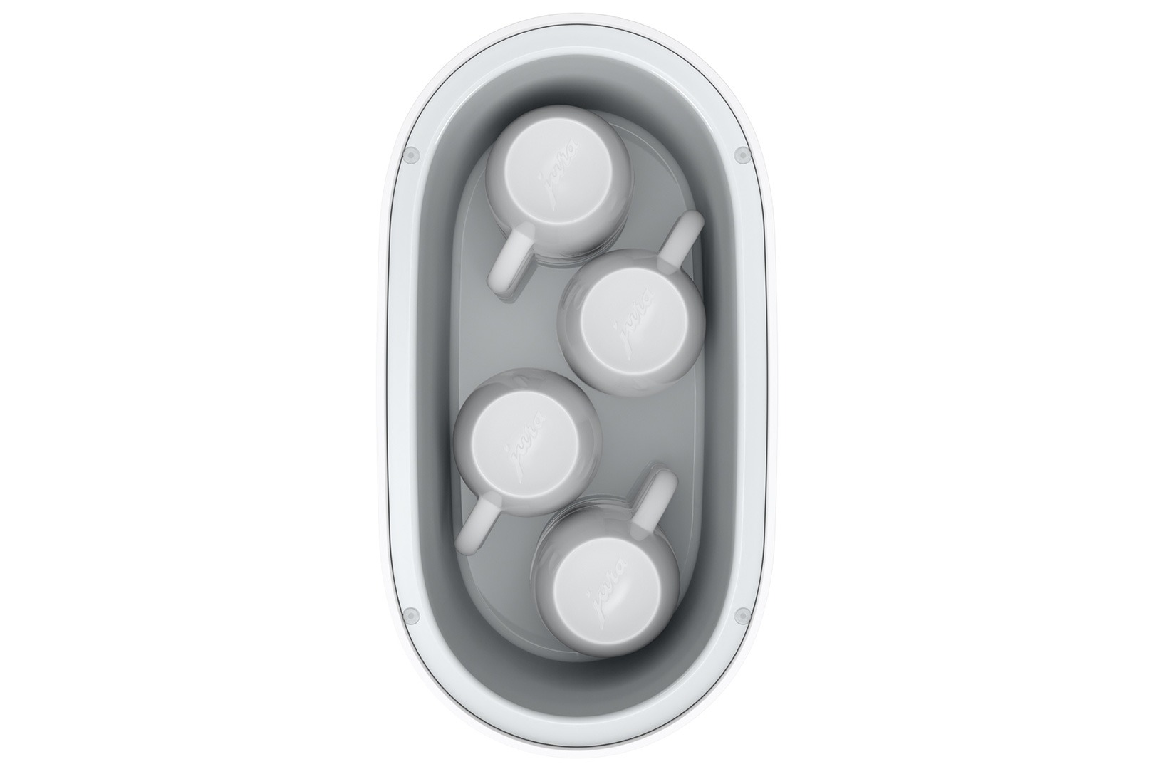 Dvě topná tělesa udržují šálky uvnitř při konstantní teplotě okolo 55 °C – ideální pro přípravu všech káv od ohnivého espressa až po cappuccino korunované mléčnou pěnou. Ohřívač šálků má také pasivně vyhřívaný hliníkový zásobník na své horní části.